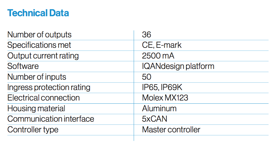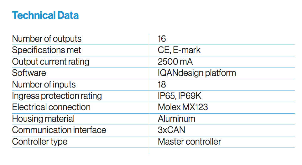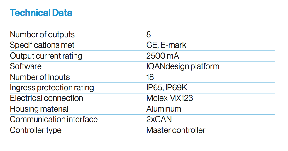 It is best for mid-size applications such as powertrain control (e.g. power shift transmissions), distributing I/O on a vehicle (physically placed by functions), or to act as an additional controller in systems where the main controller does not provide enough I/O for the system.